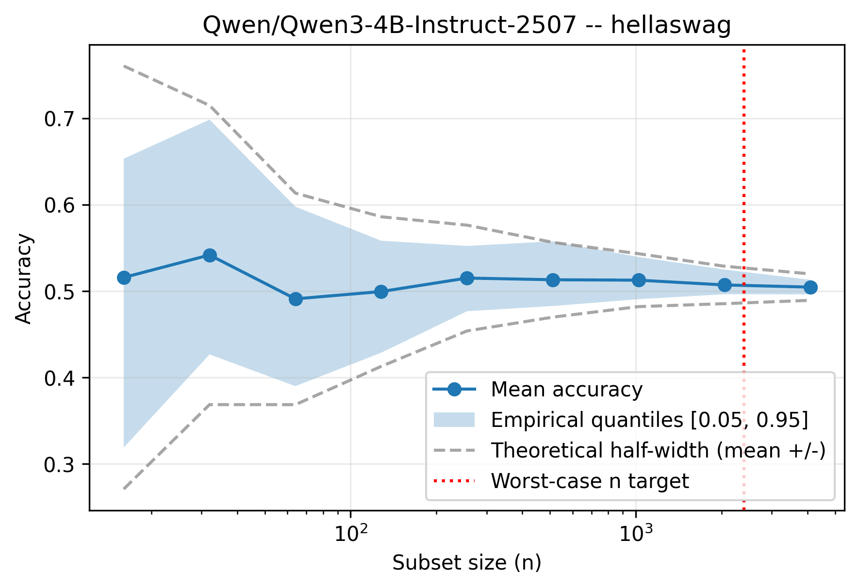 Figure 1 shows subset eval for Qwen3-4B on Hellaswag. The x-axis is the subset size, and y-axis is the accuracy. I'm using 12 random seeds to obtain the distribution of accuracy scores for each subset size . The gray dashed lines represent the theoretical confidence intervals discussed above (95% confidence) and the blue shaded area represent the range of eval accuracy as we vary the random seed. The theoretical range cover the range of the observed accuracy. The red dashed line reprsents the theoretical prediction that guarantees an estimation error of no more than from the true accuracy , with confidence.